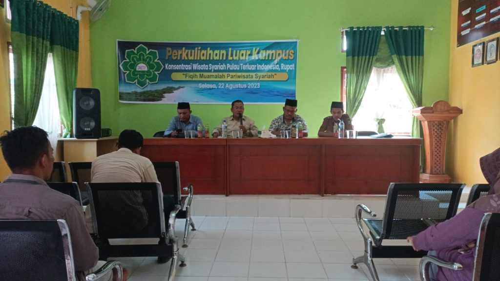 IAITFDUMAI.ac.id — Rektor IAITF Dumai, Dr H Ahmad Rozai Akbar MH memberikan perkuliahan luar kampus Konsentrasi Wisata Syariah Pulau Terluar Indonesia Pulau Rupat pada mata kuliah Fiqih Muamallah Pariwisata Syariah, Selasa (22/08/2023) di Pulau Rupat, Kabupaten Bengkalis, Riau.