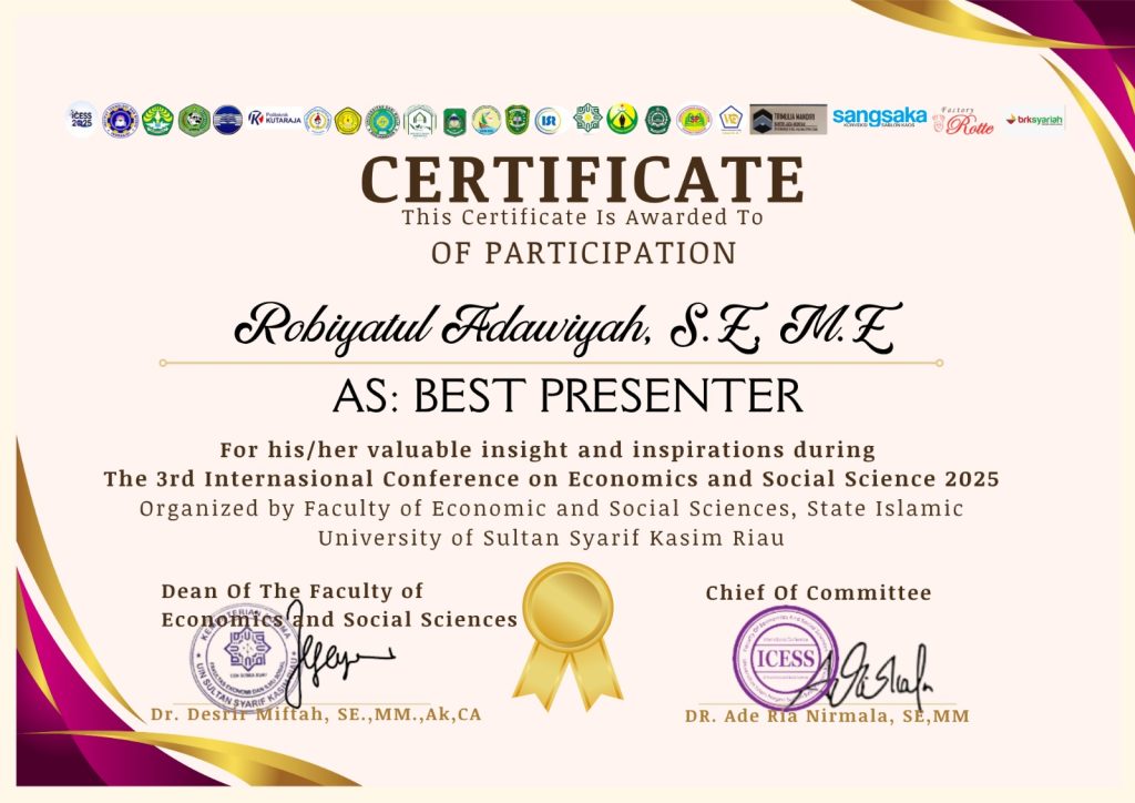 Iaitfdumai.ac.id – Dumai (12 November 2025), Kampus Dumai Institut Agama Islam Tafaqquh Fiddin (IAITF) kembali menorehkan prestasi di kancah internasional. Salah satu dosennya, Robiyatul Adawiyah, S.E., M.E., berhasil meraih penghargaan Best Presenter Award pada ajang International Conference on Economics and Social Sciences (ICESS) 2025, yang berlangsung secara daring pada 11–12 November 2025 melalui platform Zoom Meeting.